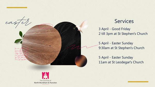 Good Friday: 2pm at St Stephen's Church Only one hour long, reflecting on Jesus on the cross. Easter Sunday: 9:30am St Stephen's Church. Come see our Easter lilies. Bring a flower to dress the cross. 11:00am at St Leodegar's Church